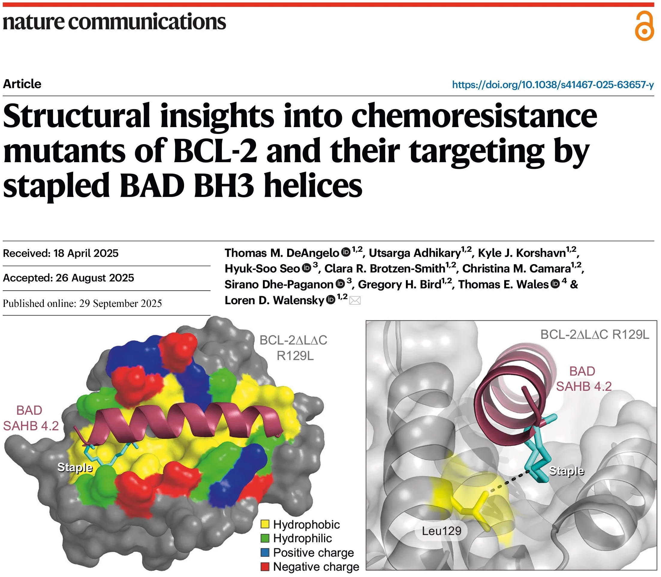 Congratulations to Tommy DeAngelo and the lab team on uncovering how venetoclax-resistance mutations alter BCL-2 conformation—and how stapled BAD BH3 helices can overcome these structural barriers to BCL-2 blockade. Lead stapled peptides preserve and even enhance binding across clinical variants, including through compensatory interactions of the hydrocarbon staple itself. The insights provide a blueprint for designing next-generation BCL-2 inhibitors capable of overcoming venetoclax resistance.